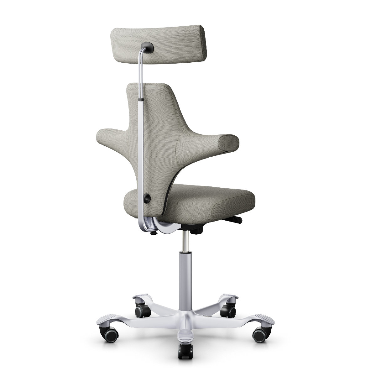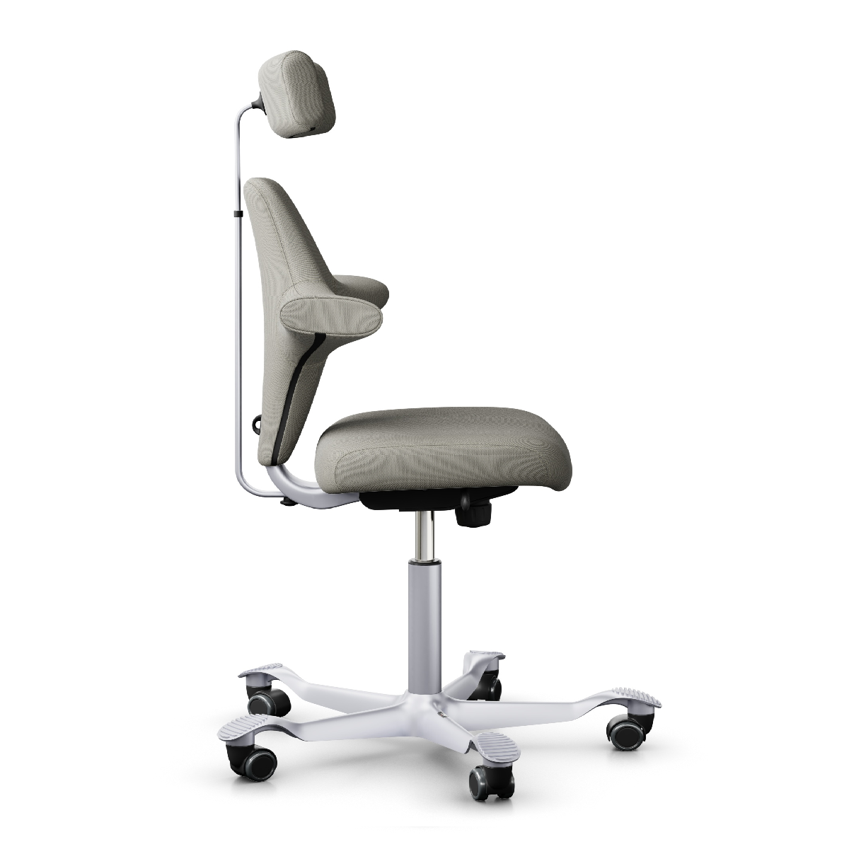 The Capisco 8127 features a dynamically adjustable headrest and a rounded shorter but conventional seat with a waterfall edge at the front enabling active seating whether in raised or lowered position, a backrest seat allowing the user to sit in various working postures with support for the back, individual arm, side and even chest to suit the task at hand.