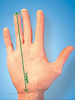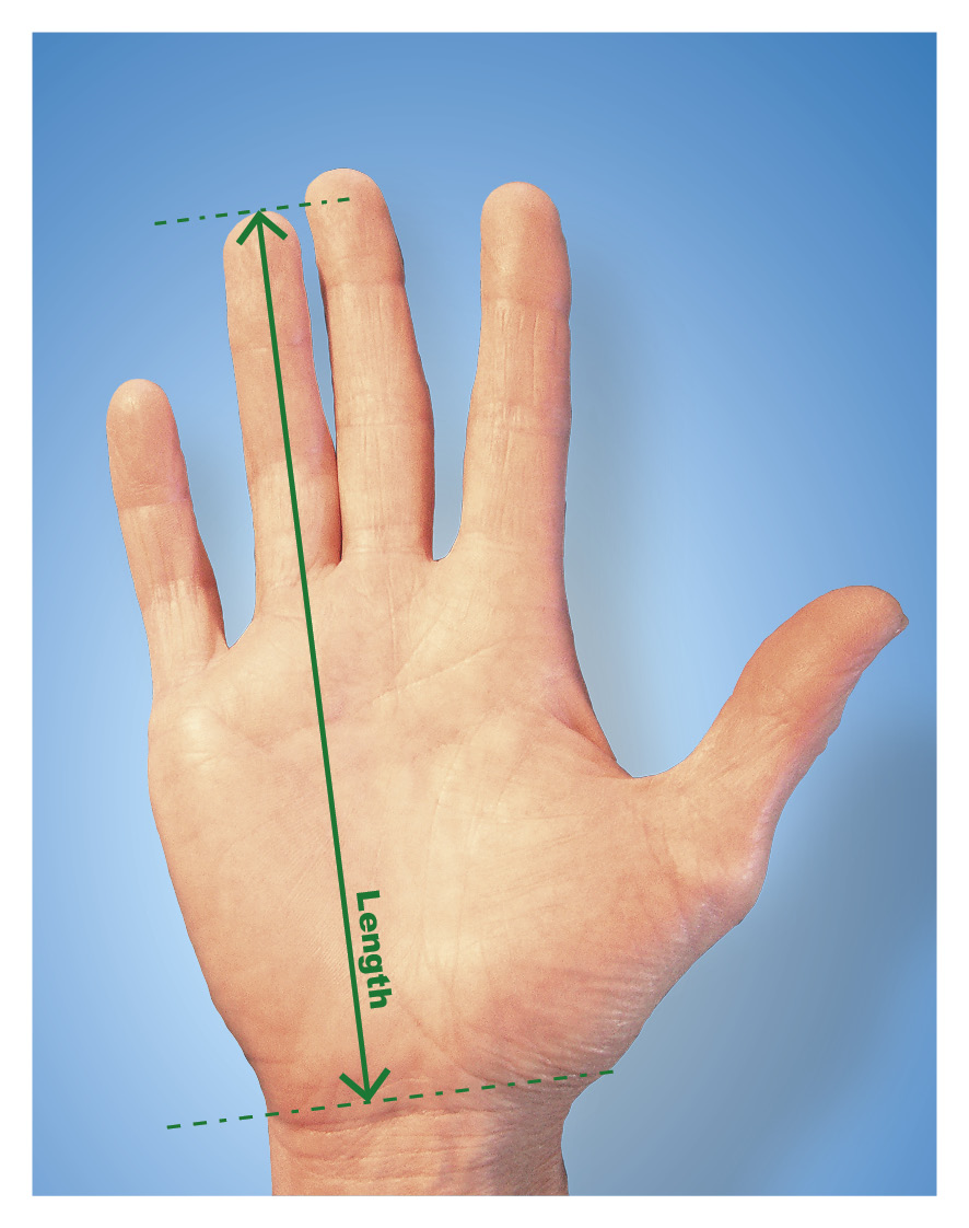 You should measure your hand size using a ruler and compare the result to determine the recommended size. Measure from the tip of the ring finger to the first wrist crease with your hand held flat, as shown in the image below.