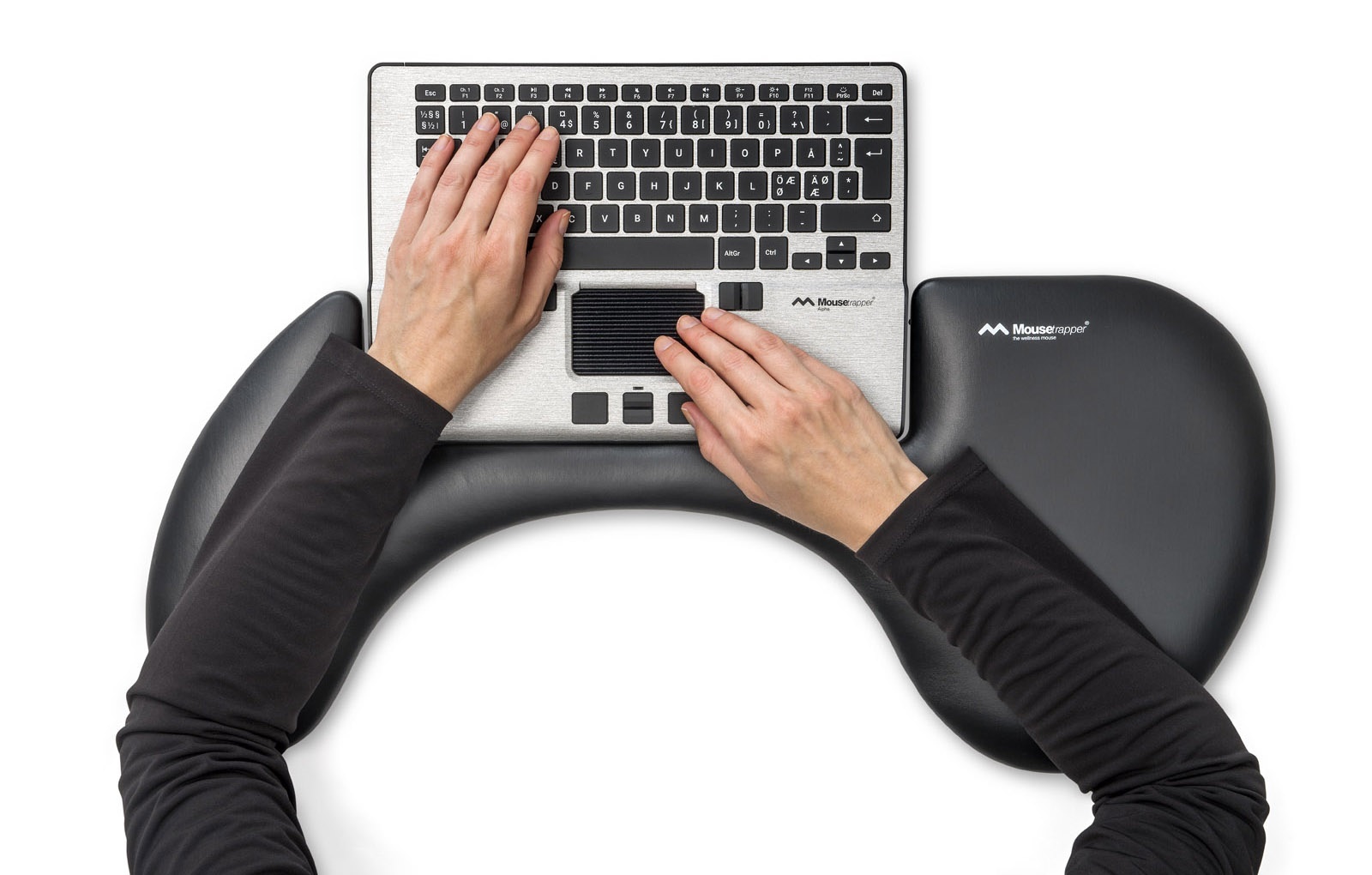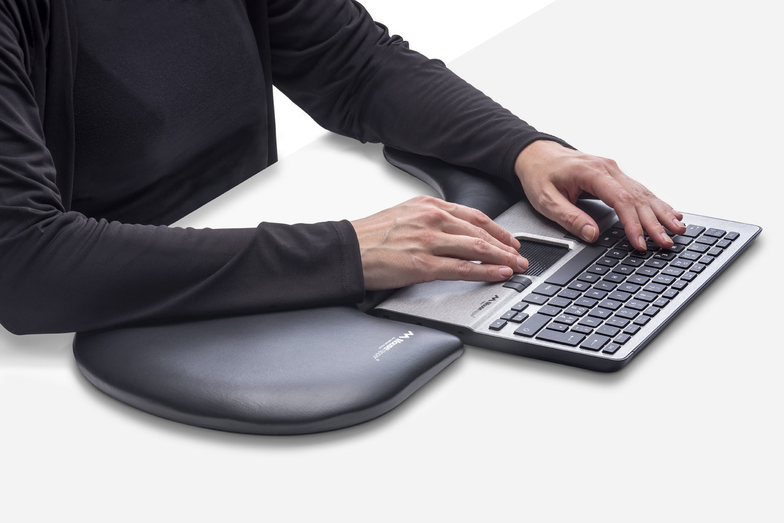 The asymmetrical design promotes a naturally centred and relaxed working position in front of your Mousetrapper Alpha (or similarly sized keyboards). Helps to relieve strain in your neck, shoulders, back and forearms and prevents the risks of carpal tunnel syndrome and strain injuries. Thanks to the uniquely thin central section, (only 40 mm deep), it encourages you to work very close to the keyboard, which prevents over-stretching your forearms.