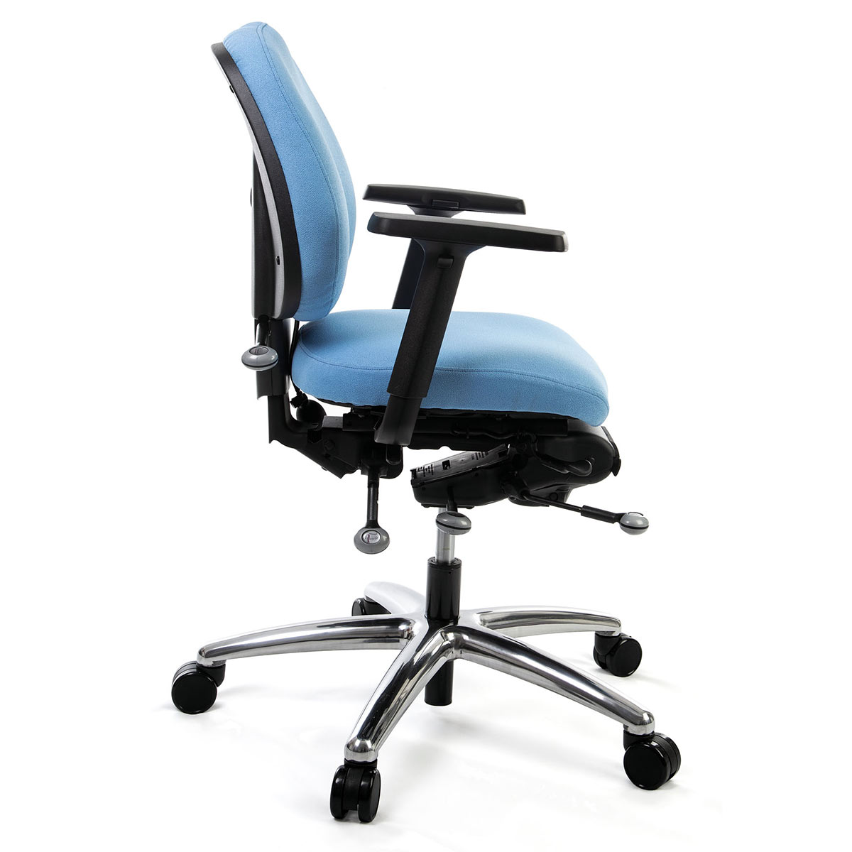 OPERA 20 chairs come with a polished aluminium base and newly updated pebble levers which deliver a premium look. These levers not only look attractive but offer enhanced ergonomic benefits. Operational instructions are easier to see and the pebble shape makes the levers easier to handle, which is ideal for people with health problems that affect their hands and arms.