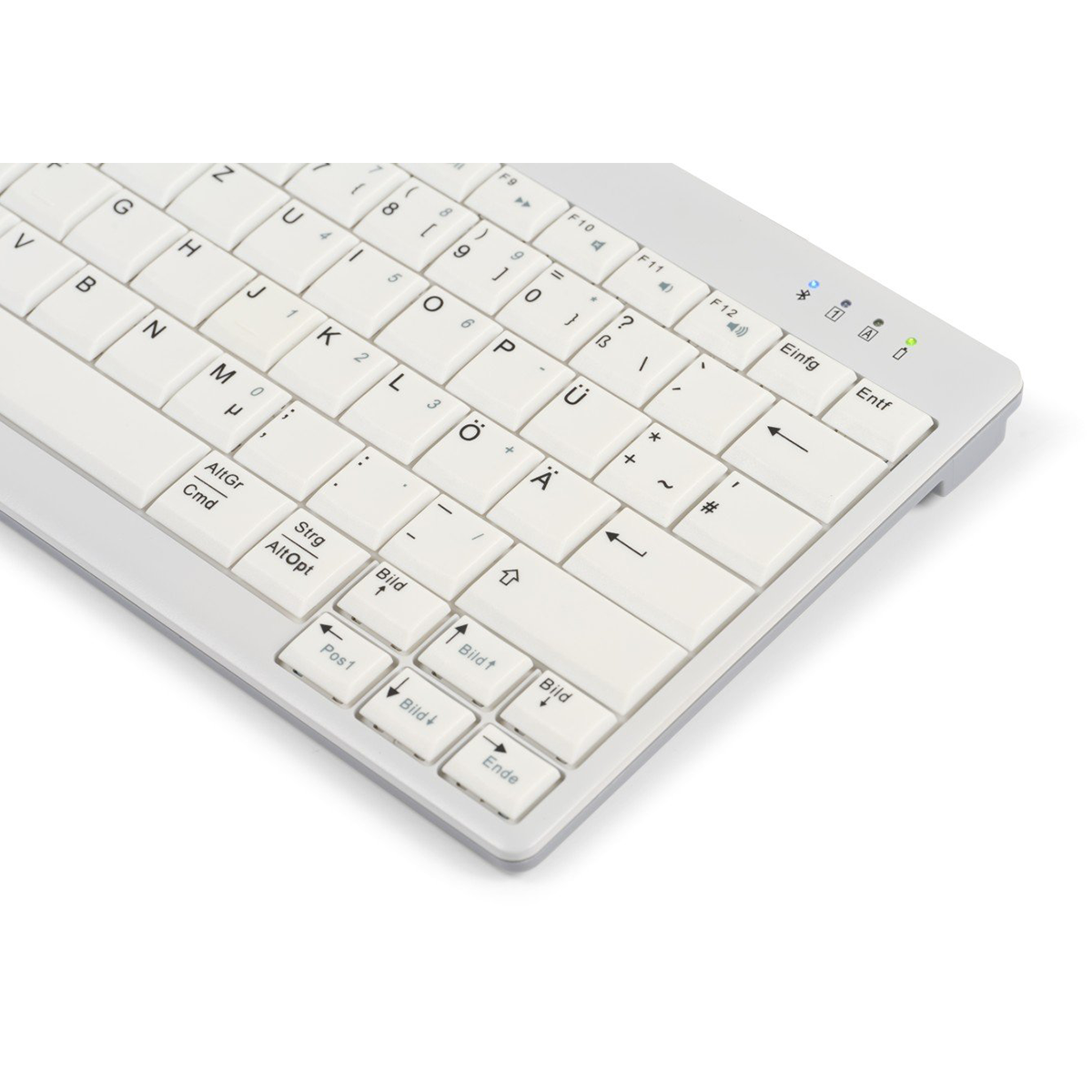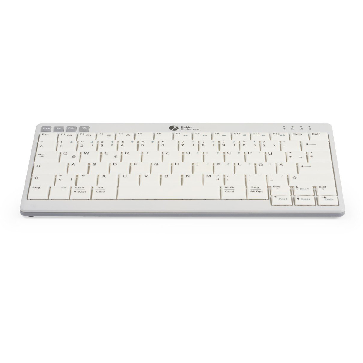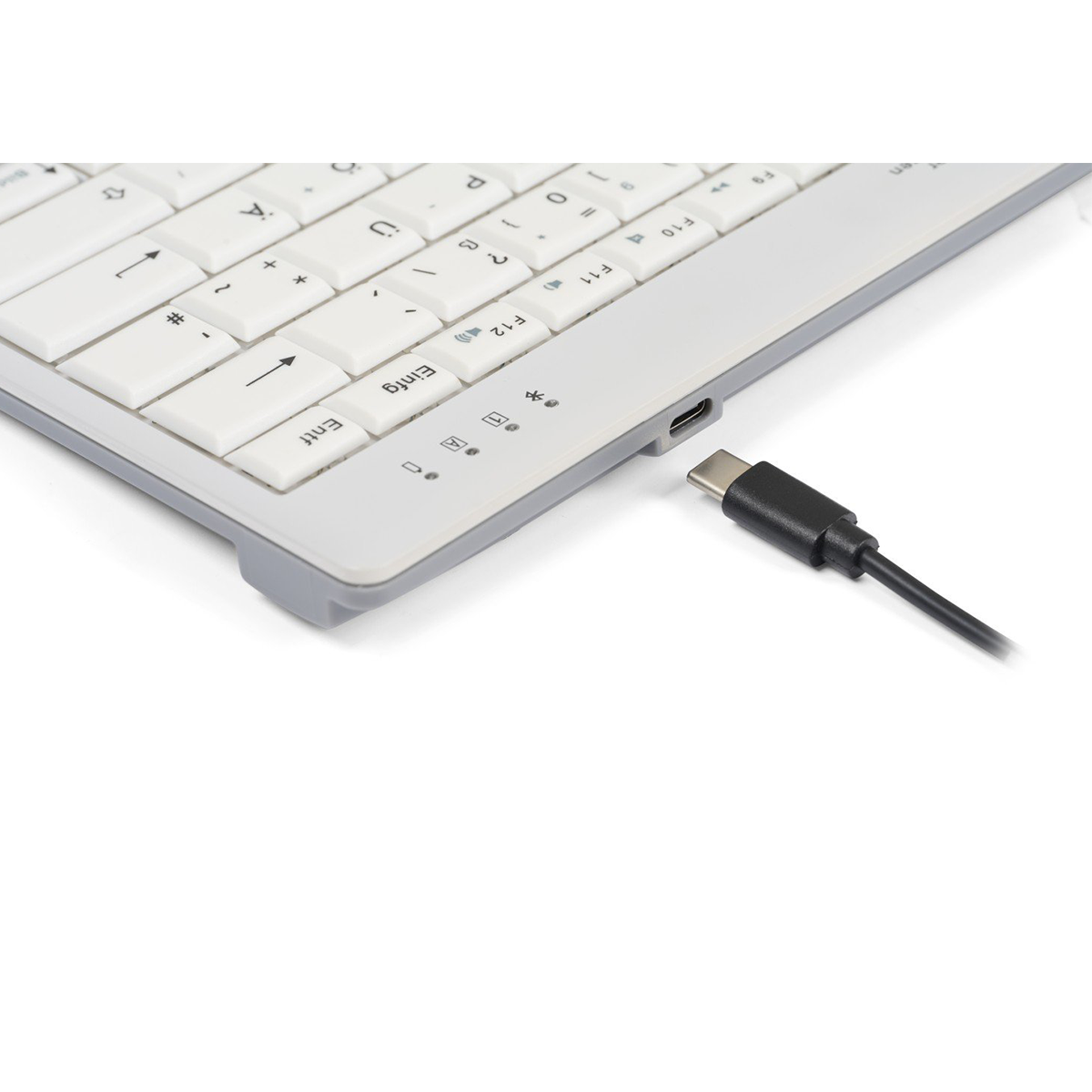 Despite its small size, it’s fully featured: scissor-switch keys with a 19 mm key centre spacing, concave keycaps with high-contrast dark lettering on a light background for clear visibility, plus hotkeys, multimedia keys, and status LEDs.