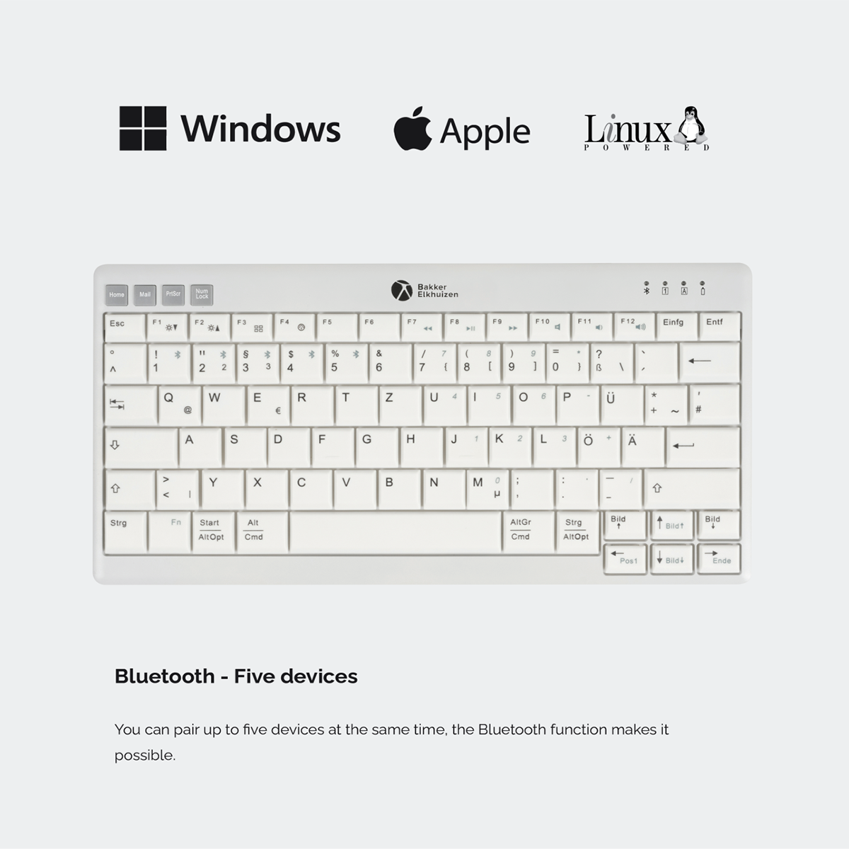 The UltraBoard 950 V2 Wireless by BakkerElkhuizen is a compact, ergonomic Bluetooth keyboard designed for portability, comfort, and productivity. Thanks to its slim tenkeyless layout, it reduces the distance to your mouse — promoting a healthier work posture and reducing strain on your forearm and shoulder.