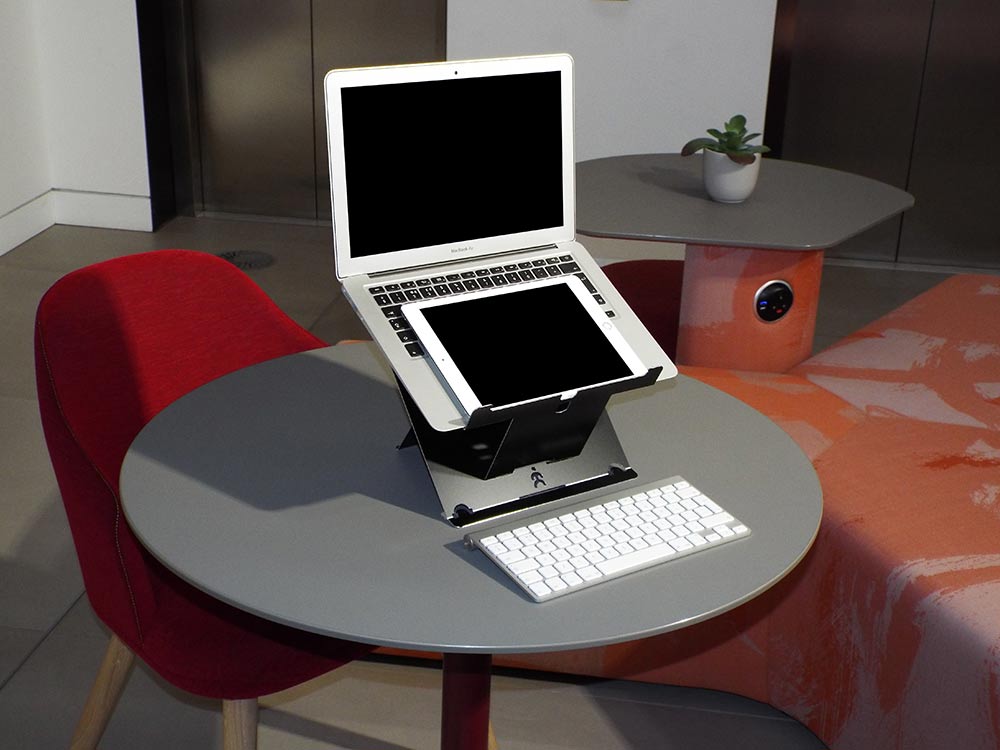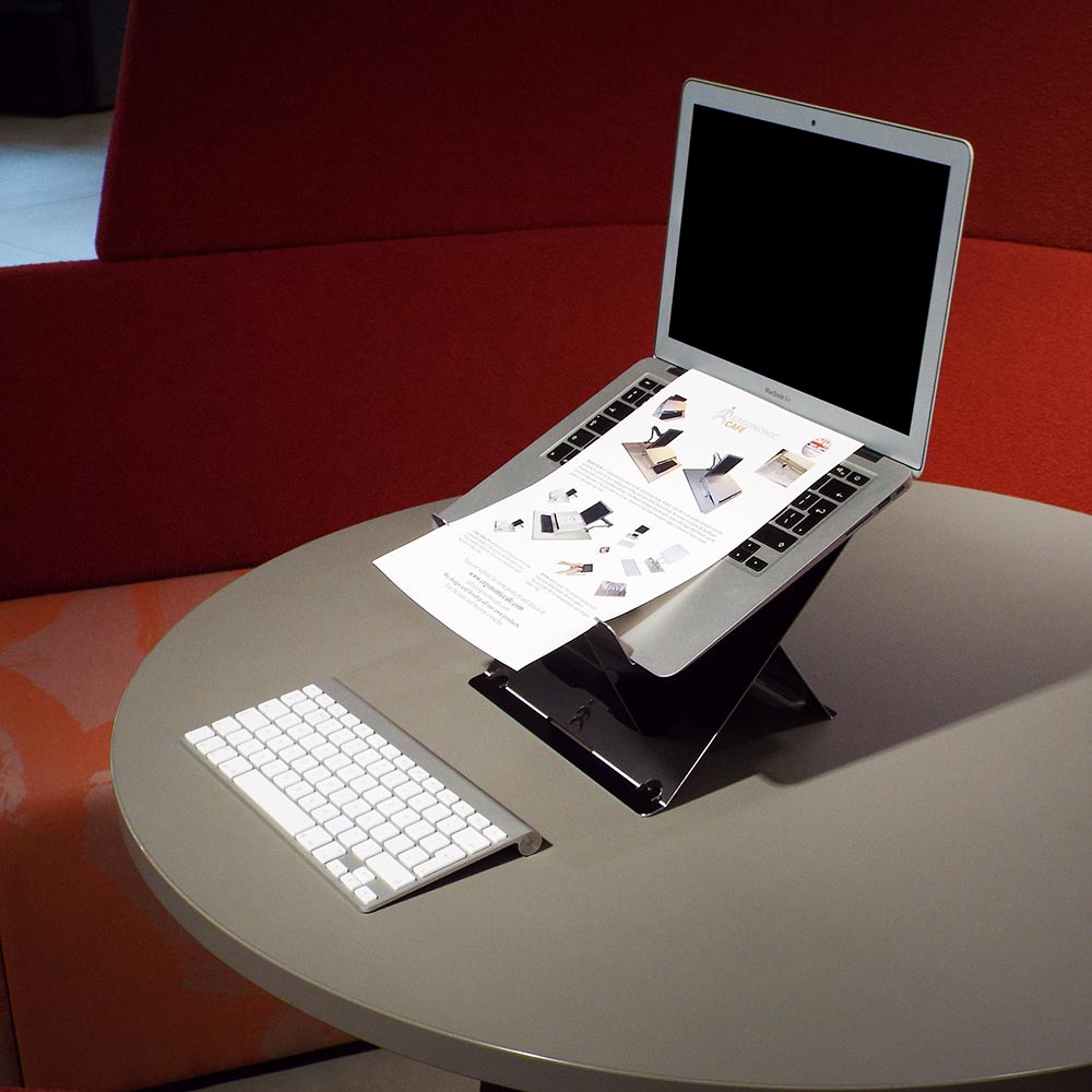 The Agile laptop stand from the Ergonomic Cafe fits almost any 15” laptop, and can be transferred to another laptop easily. This innovative product boasts 2 impressive benefits for its user. First is the option to deploy the ‘Smart Type’ arms, which slightly raise the rear of the laptop to improve the viewing and typing angles for direct use of the laptop. Second are the 4 higher angles offered by the ‘Smart Set’ system for use with an external keyboard and mouse. Simply choose the setting which best suits you personal requirements, then each time you pull the ‘Smart Set’ handle the stand will automatically deploy to your chosen setting. For these outstanding benefits the Agile laptop solution has been awarded the coveted FIRA Ergonomic Excellence Award for the unique and outstanding ergonomic benefits it offers the user.